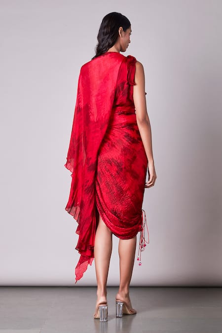 Red Chiffon Asymmetric Draped Saree Dress