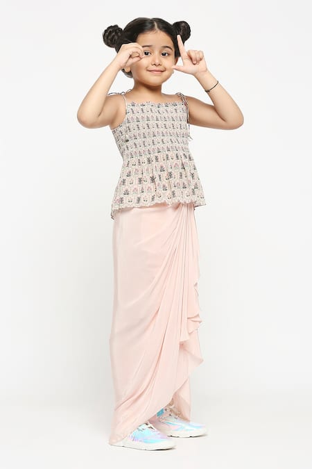 Pink kurta featuring floral printed motifs and tie-up details. Paired with a draped skirt for a stylish look.