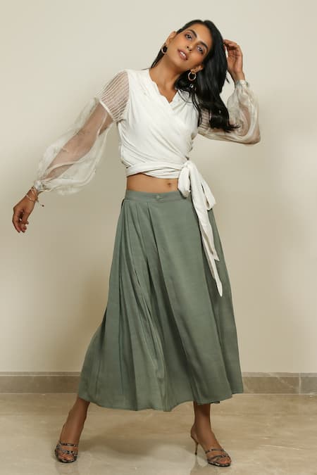 White Silk Organza, Cotton Georgette V Neck Draped Wrap Top