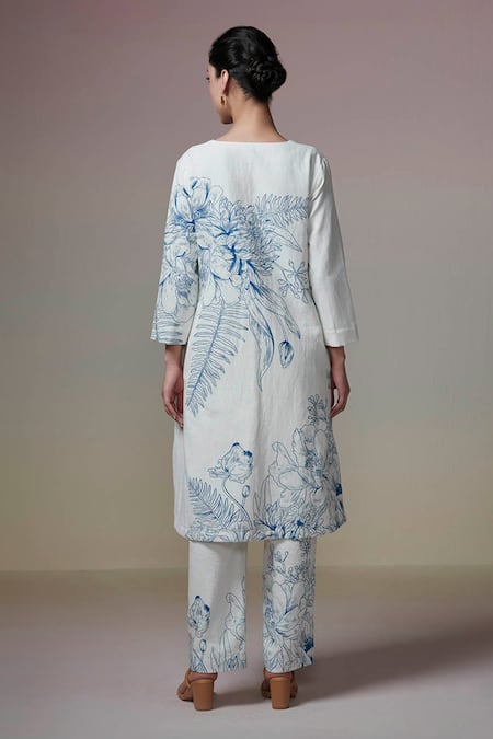 Ivory Linen, Cotton V-neck Floral Printed Kurta Set