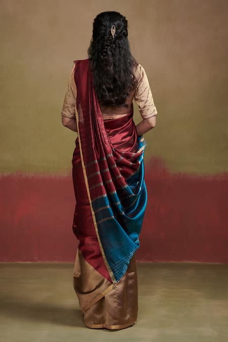 Gold, maroon, and blue colorblocked saree crafted in handloom silk with a stripe pattern pallu