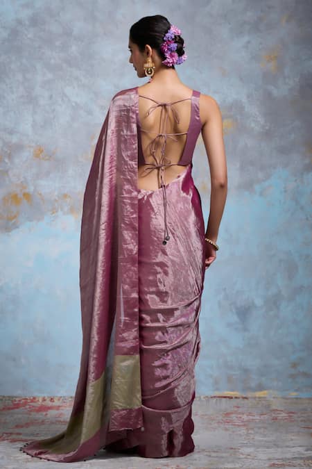 Purple handwoven metallic handloom saree featuring a contrast green pallu and bead tassels. Comes with an unstitched blouse piece for customization.