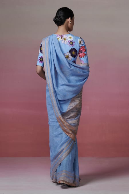 Buy_Dressfolk_Blue Linen Zari Dream Handwoven Saree With Running Blouse_Online_at_Aza_Fashions