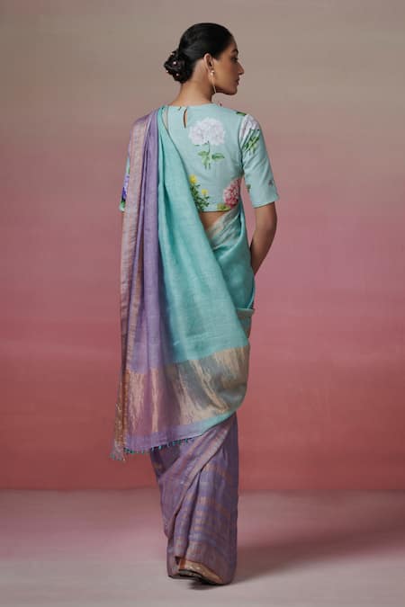 Teal blue and lavender ombre handwoven saree featuring a metallic zari border and pallu. Accompanied by an unstitched blouse fabric.