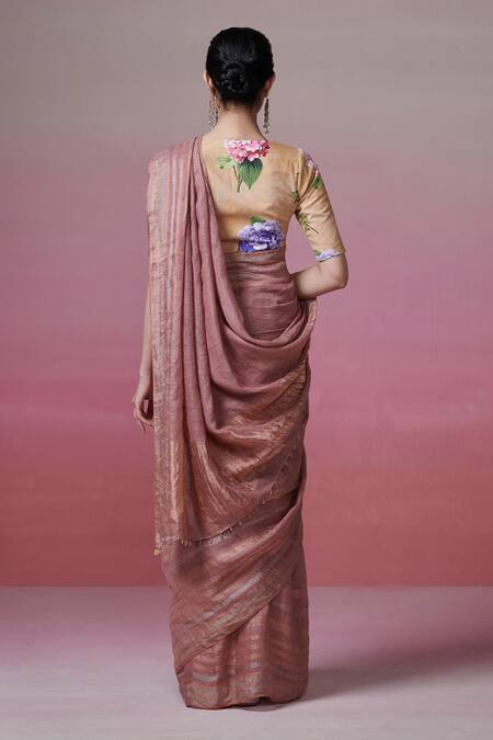 Pink Linen Zari Onion Handwoven Saree With Running Blouse