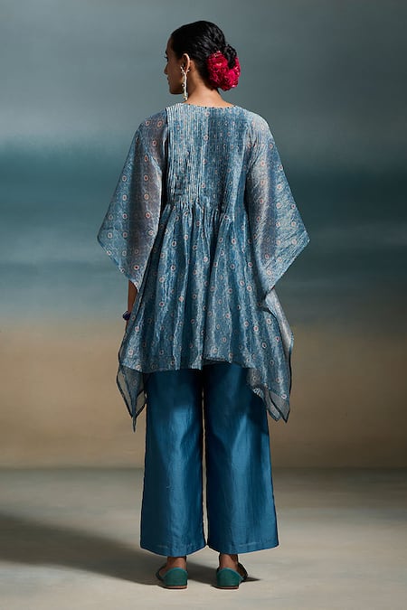A blue pleated kaftan crafted from printed stripe Chanderi fabric with an attached lining. It is paired with solid blue Chanderi pants.