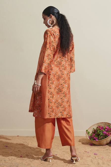 Orange floral Chanderi kurta featuring a V-neckline and three-quarter sleeves. Paired with matching pants and an inner slip for complete coverage.