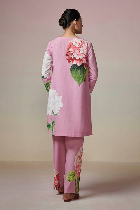 Pink kurta featuring floral digital print and a V neckline. Paired with matching pants.