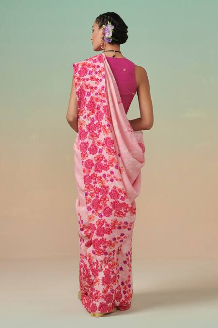 Pink handloom linen saree with floral print design. Paired with a non-padded blouse featuring an attached lining.