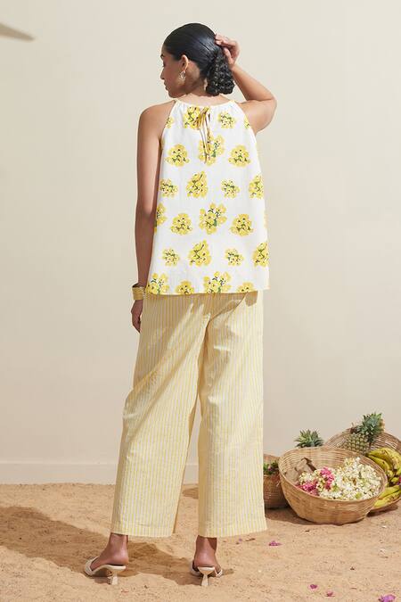 Ivory Cotton Halter Neck Floral Print Top And Striped Pant Set