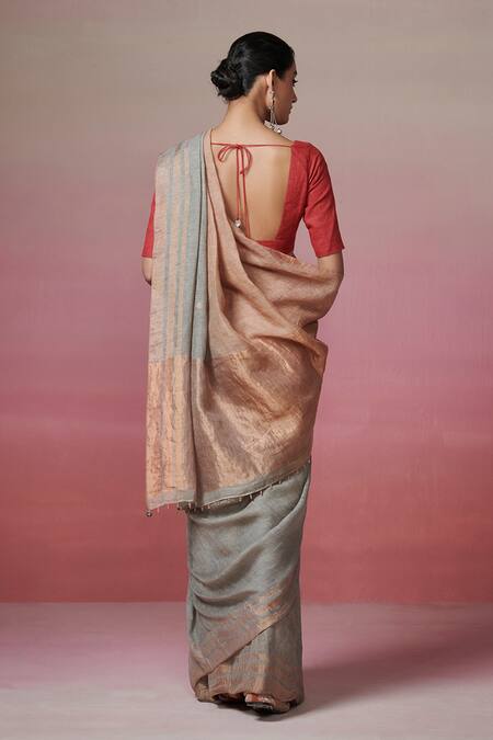 Gold & grey saree made from handloom linen with an attached blouse. The saree measures 5.5 meters in length and 44 inches in width.