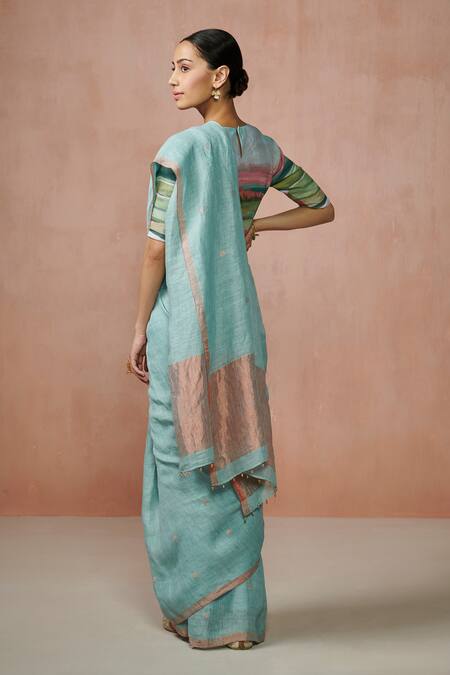 Blue handloom linen saree featuring a length of 5.5 meters and a width of 44 inches. Paired with a non-padded blouse with attached lining.