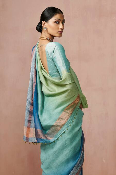 Royal blue and light green handloom linen saree with an attached blouse. Features a padded blouse and a length of 5.5 meters with a width of 44 inches.