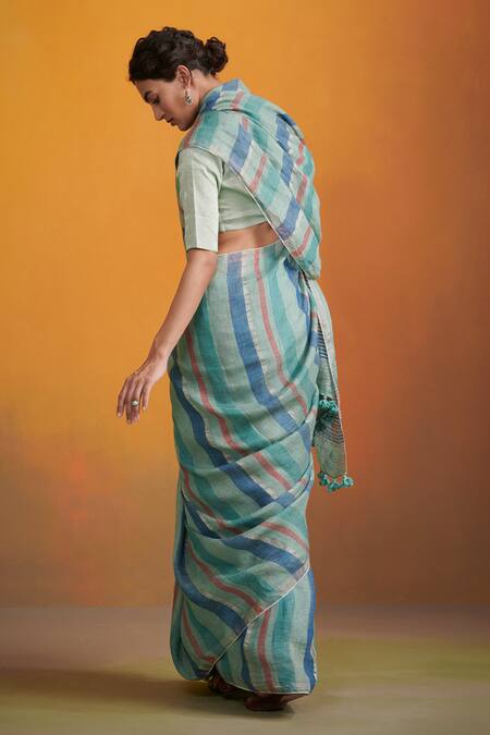 Handloom linen saree in green and blue shades featuring an attached blouse. The saree measures 5.5 meters in length and 44 inches in width.