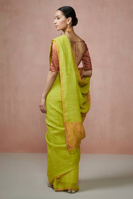 Green handloom linen saree with an attached blouse featuring padding. The saree measures 5.5 meters in length and 44 inches in width.