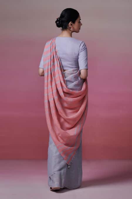 Dusty blue and pink handloom linen saree with attached blouse. The saree features a length of 5.5 meters and a width of 44 inches.