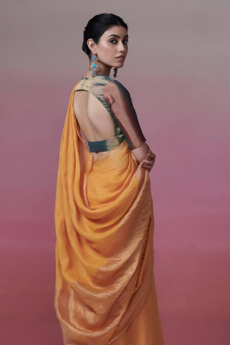 Yellow handloom linen saree with an attached blouse featuring padding. The saree measures 5.5 meters in length and 44 inches in width.