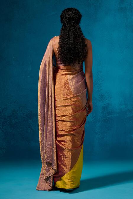 Yellow, maroon & lilac handloom tissue saree with an attached blouse. The saree measures 5.5 meters in length and 44 inches in width.