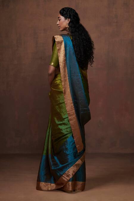 Handloom tissue saree in green, olive, and turquoise shades featuring an attached blouse. The saree measures 5.5 meters in length and 44 inches in width.