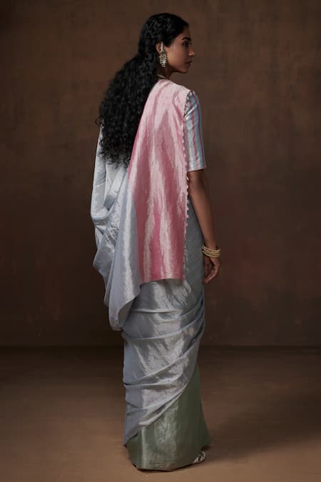 Pastel green and pastel blue metallic zari saree in chanderi tissue base with bead details on the border
