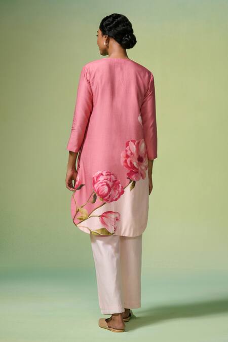 Pink chanderi kurta featuring a floral print with a curved hem and side pocket. Paired with solid straight pant for a coordinated look.
