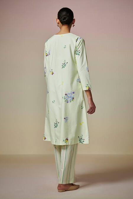 Pista green kurta featuring floral digital prints and a V neck design. Paired with striped pants for a coordinated look.