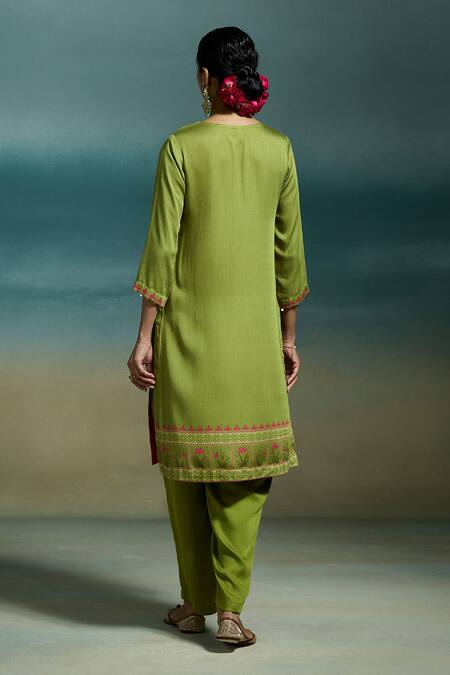 A lime green straight kurta crafted from modal satin, featuring a placement print with delicate surface detailing on the yoke and hem. It is paired with coordinating modal satin pants and a maroon dupatta with a geometric print and embellished border.