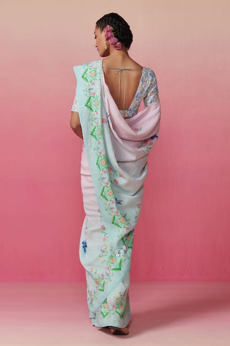 Light blue and pink ombre handloom linen saree featuring floral embroidery. Paired with a padded blouse and attached lining.