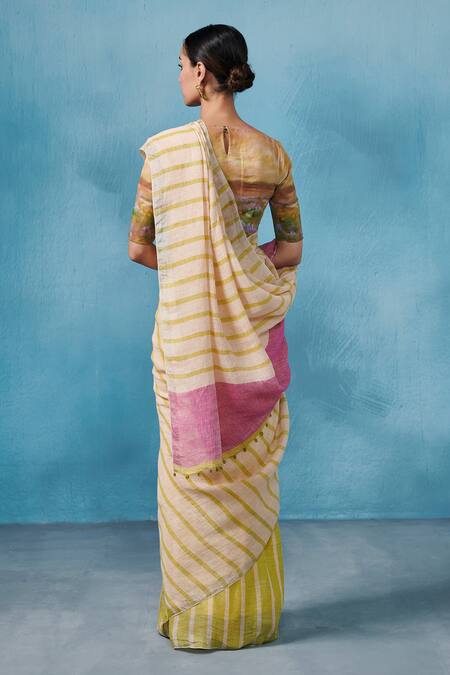 Light green handloom linen saree featuring striped patterns and an attached blouse. The saree measures 5.5 meters in length and 44 inches in width.