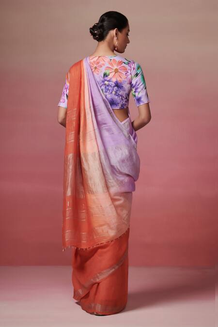 Light purple handloom linen saree with an ombre effect transitioning to peach and orange. Paired with a matching blouse featuring floral embroidery.