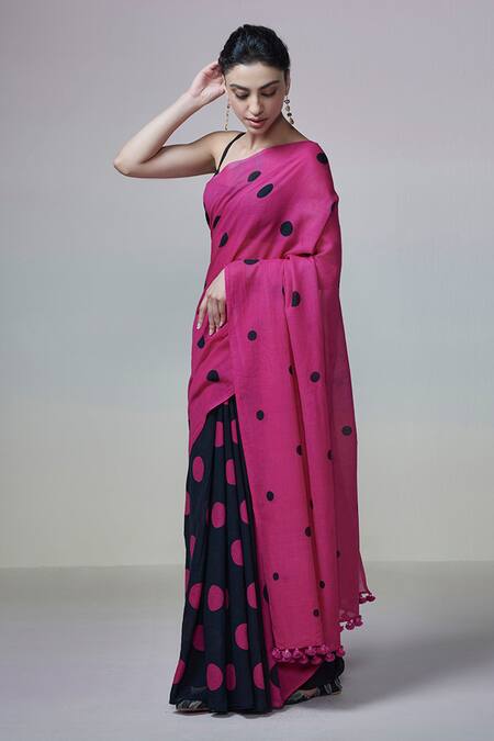 Magenta saree featuring black polka dots in a handloom cotton fabric. Includes a padded black blouse with an attached lining.