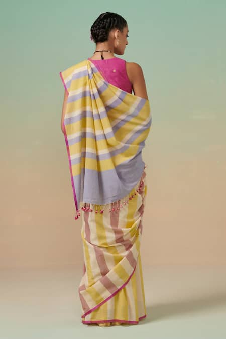 Yellow handloom cotton saree featuring a candy striped pattern with fuchsia pink border detailing. Comes with an unstitched blouse piece for custom fitting.