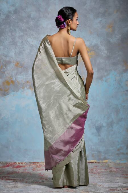 Sage green handwoven metallic saree featuring a contrast pink pallu and bead tassels. Comes with an unstitched blouse piece for customization.