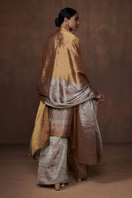 Silver kurta featuring a stripe pattern with side slits and V neckline. Paired with matching pant and dupatta, both in a metallic finish.