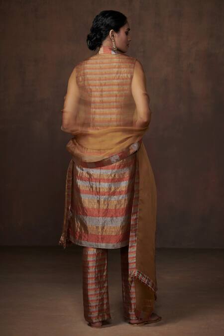 Silver Tissue Embroidery V-neck Metallic Stripe Kurta Set