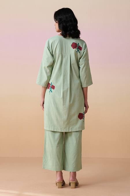 Mint blue kurta featuring hand block floral and stripe print. Paired with coordinating mint blue straight pants.