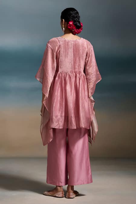 Pink Chanderi Embroidery, Sequins V-neck Mishti Pleated Kaftan With Pant
