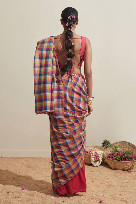 Buy_Dressfolk_Cotton Multi Check Saree With Running Blouse_at_Aza_Fashions
