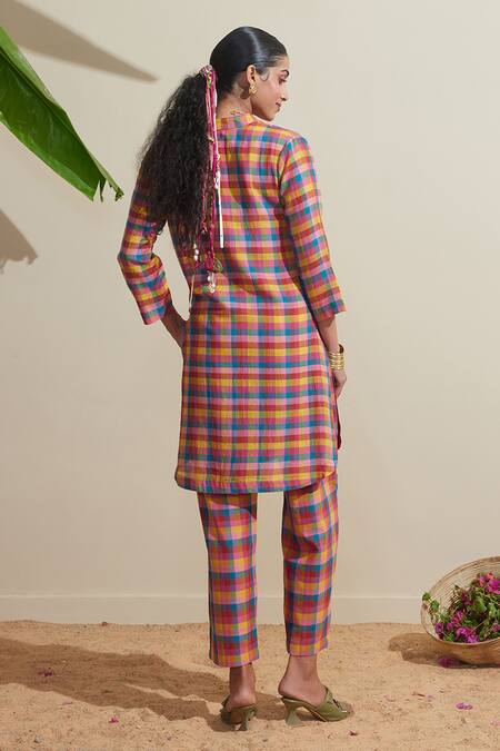 Multi color kurta featuring a checkered pattern with a notch collar and button placket. Paired with matching checked pants for a coordinated look.