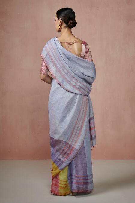 Multi-color handloom linen saree featuring a blend of blue, pink, and yellow stripes. Paired with a non-padded blouse with an attached lining.