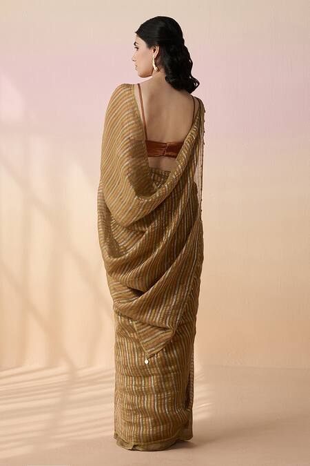Multi color saree in handloom linen featuring a striped pattern. Paired with a padded blouse with an attached lining.