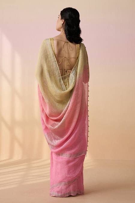 Multi color saree in handloom linen featuring a padded blouse. The saree measures 5.5 meters in length and 44 inches in width.