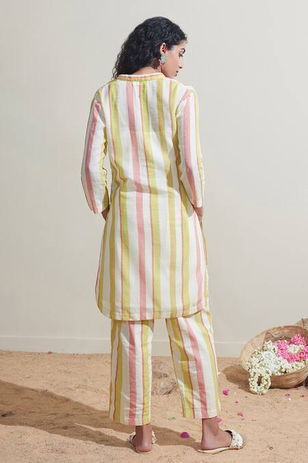 Multi color striped kurta featuring a mandarin collar and button placket. Paired with matching striped pant in a tunic length.