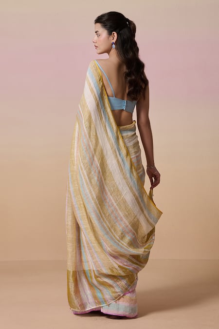 Handloom linen saree featuring multi-colour stripes.
