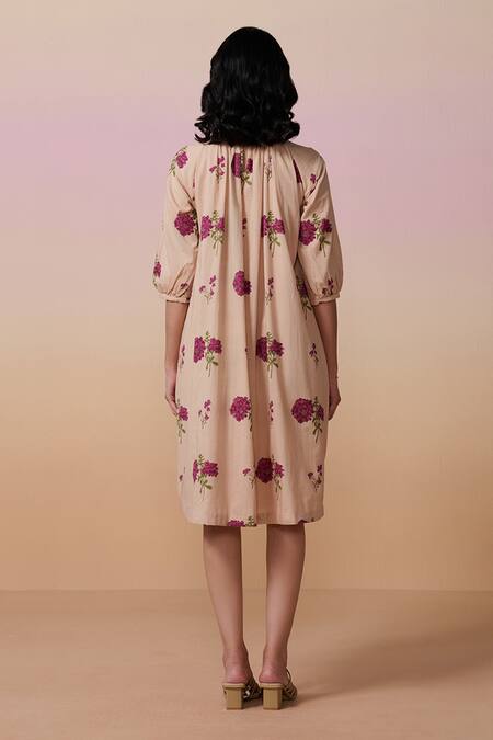 Pink Cotton Embroidery Round Neck Onion Hand Block Printed Midi Dress