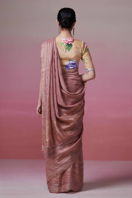 Pink Handloom Cotton Beads Onion Linen Saree With Running Blouse