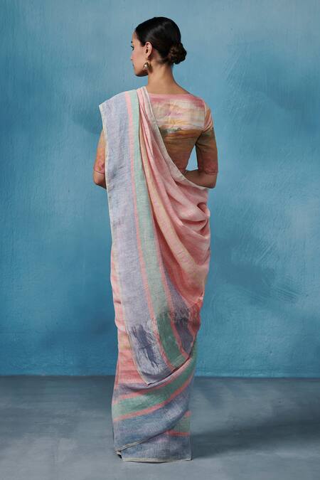 Pink and multi-color handloom linen saree featuring a striped pattern. Paired with a non-padded blouse and attached lining.