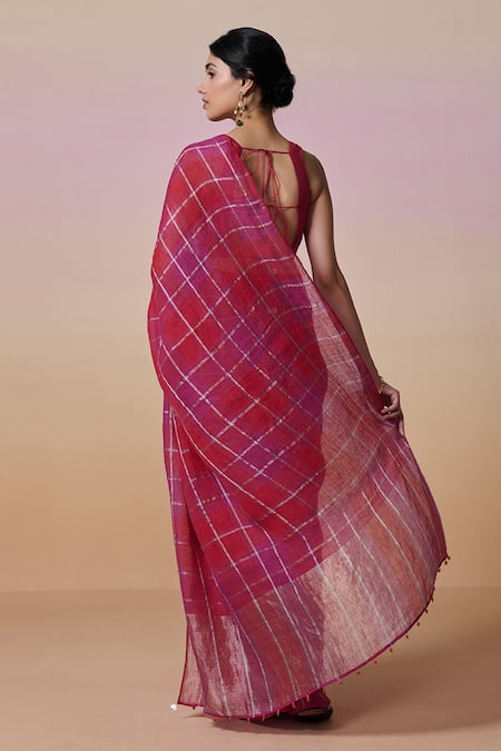 Buy_Dressfolk_Pink Handloom Cotton Zari Rani Checks Linen Saree With Running Blouse_Online_at_Aza_Fashions