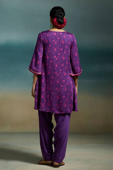 Purple Modal, Satin Foil Printing, Zari Split V-neck Revati Printed Kurta Set