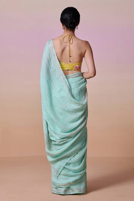 Sky blue saree in handloom linen featuring an attached lining. Paired with a padded blouse.